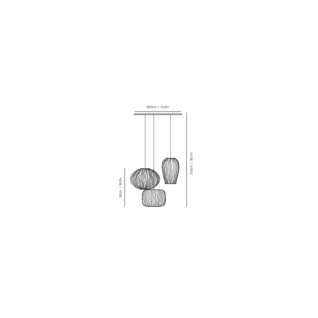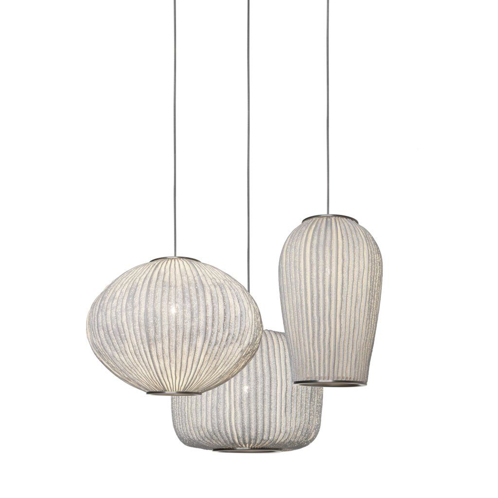 Jedinečné závěsné svítidlo na radiální rozetě spojuje tři světelné objemy do kompozice inspirované korálovými útesy s rozmanitými tvary a elegantními liniemi.
