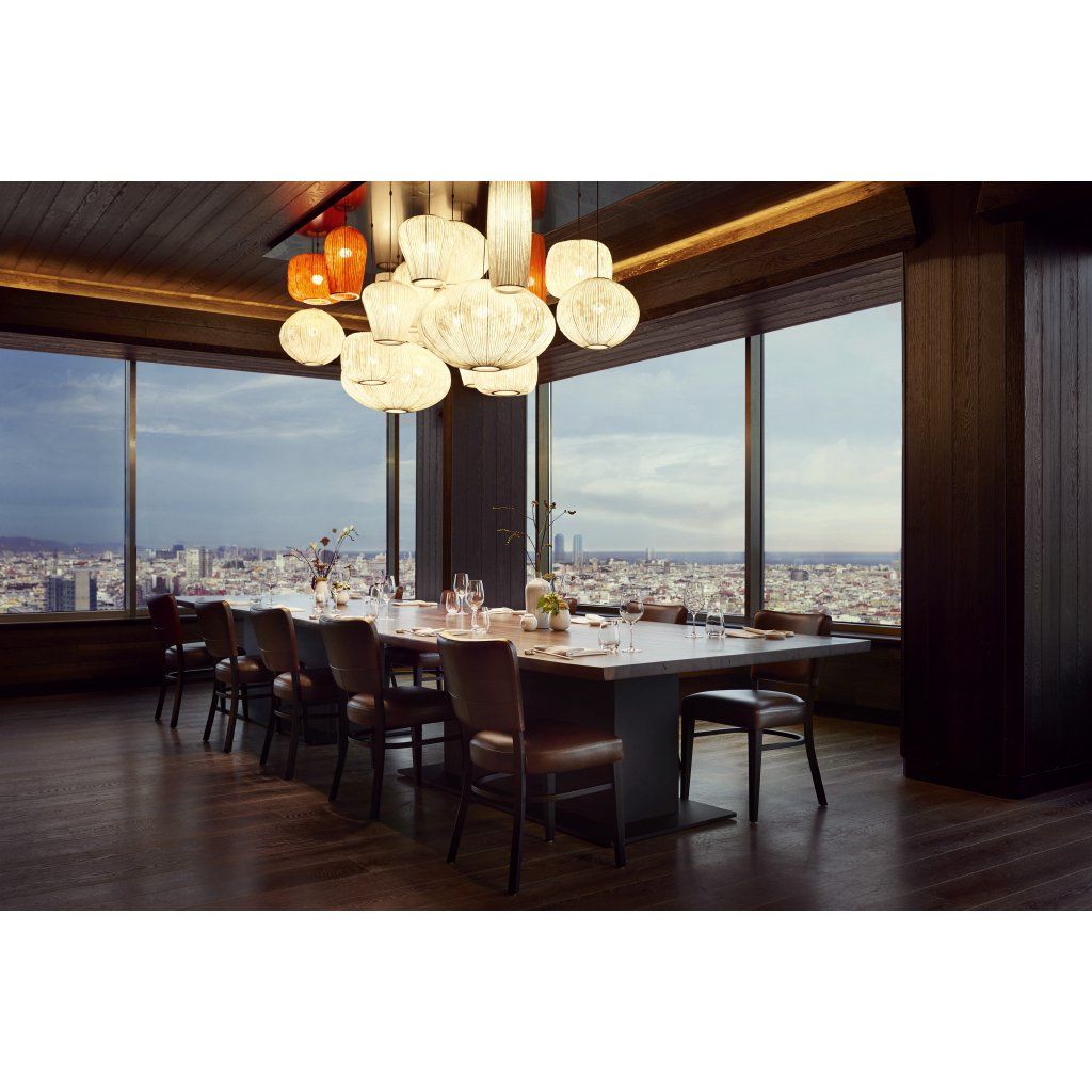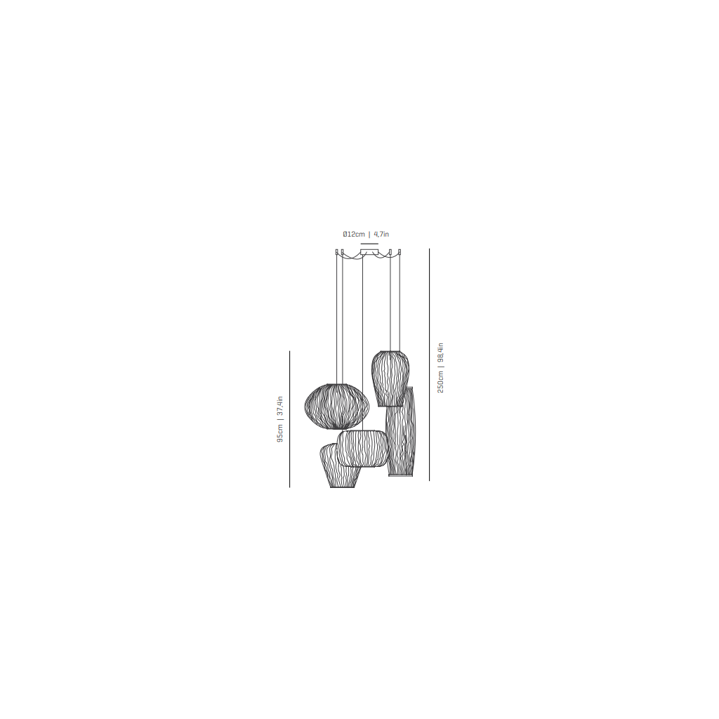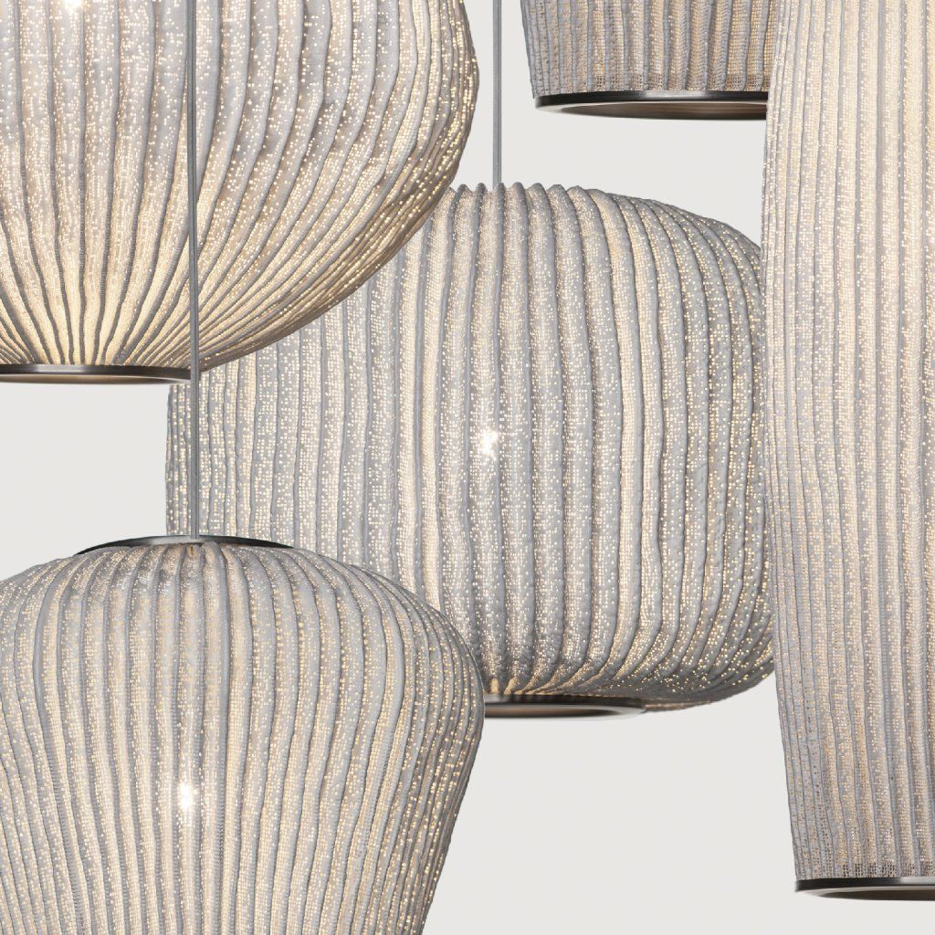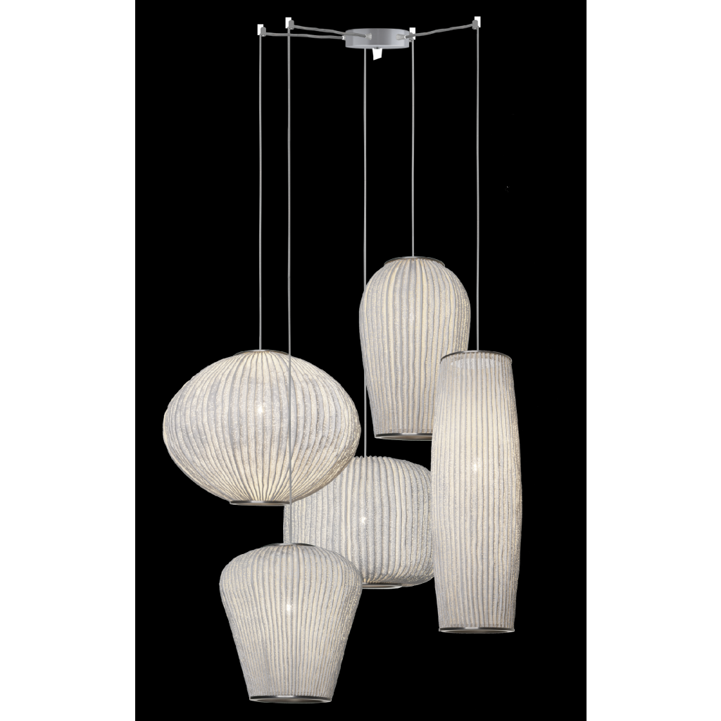 Jedinečné závěsné svítidlo na radiální rozetě spojuje pět světelných objemů do kompozice inspirované korálovými útesy s rozmanitými tvary a elegantními liniemi.