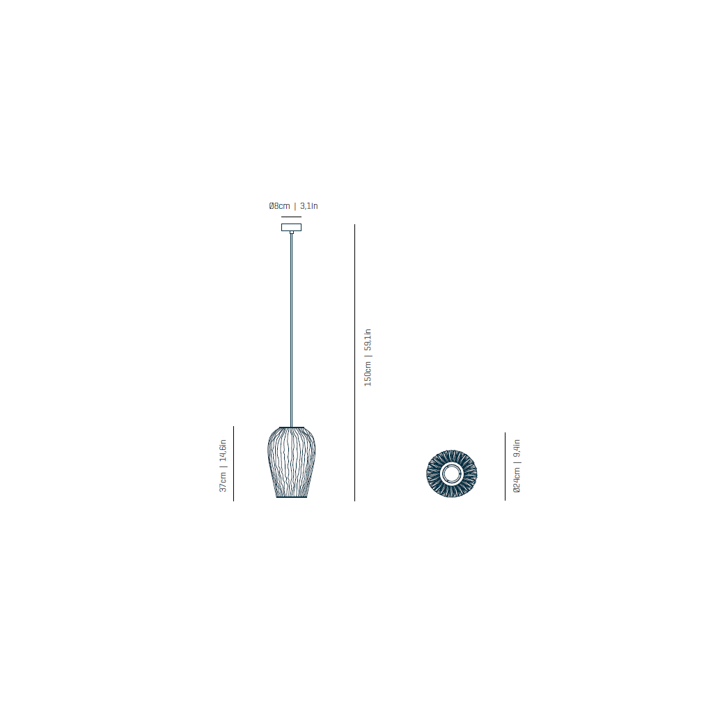Čirý napájecí kabely (je možné změnit za černý). Bílá kovová kulatá stropní rozeta průměr 8cm (je možné změnit za černou) . Maximální délka závěsu i se svítidlem je 150cm (je možné prodloužit za příplatek). Svítidlo je možné dodat také v barvě taupe, šedá, béžová (cena na poptání).