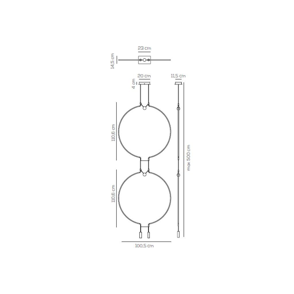 Délka 2x91cm, šířka 84,5cm, celková délka svítidla včetně závěsu je 500cm, závěs je možné zkrátit.