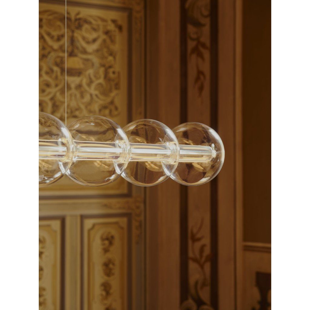 Základna svítidla je vyrobena z precizně zpracovaného hliníku, zatímco jednotlivé světelné koule jsou z čirého skla, které podtrhuje lehkost a sofistikovanost celého designu.