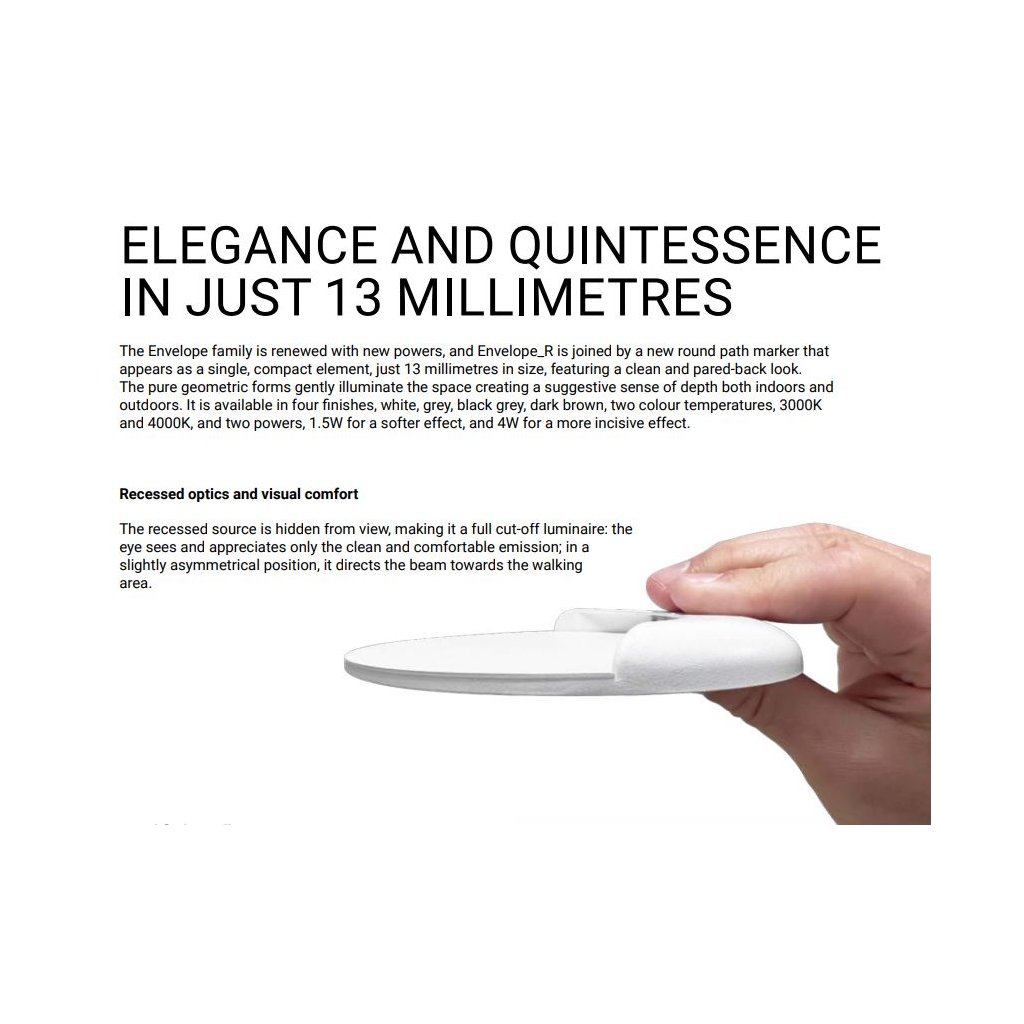 Rodina i-Led Envelope je obnovena o nové schopnosti a Envelope_R je doplněna novou kulatou značkou cesty, která se jeví jako jediný kompaktní prvek o velikosti pouhých 13 milimetrů s čistým a zkráceným vzhledem. Čisté geometrické formy jemně osvětlují prostor a vytvářejí sugestivní pocit hloubky uvnitř i venku. Je k dispozici ve čtyřech povrchových úpravách, bílá, šedá, černošedá, tmavě hnědá, dvě barevné teploty, 3000K a 4000K, a dva výkony, 1,5W pro jemnější efekt a 4W pro pronikavější efekt.