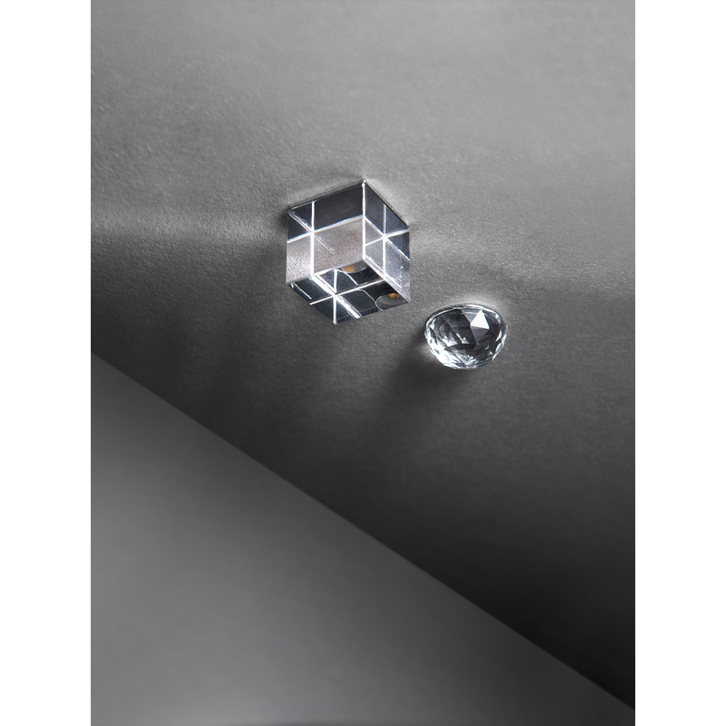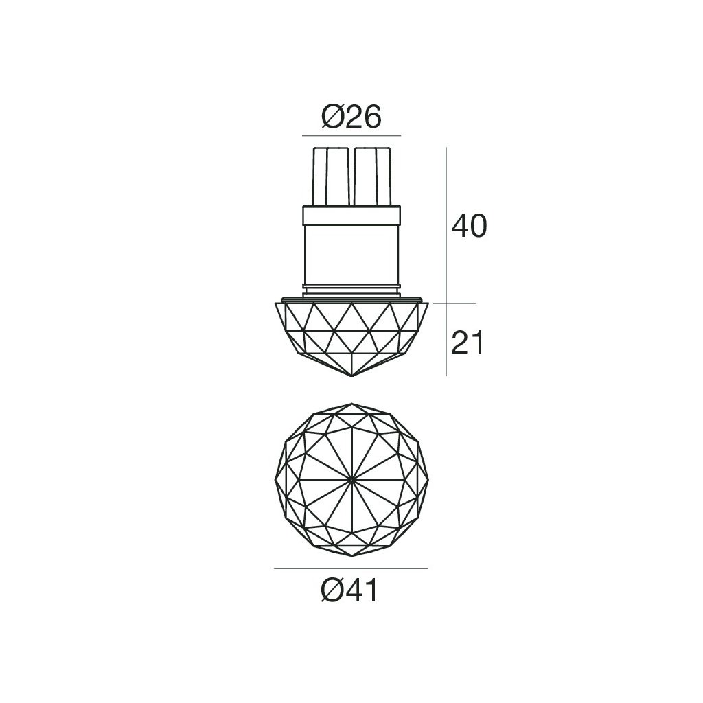 Tělo je vyrobeno z pochromované mosazi, čočka je z krystalového, čirého skla. Průměr: 4,1cm, celková výška: 6,1cm z toho 2,1 cm viditelná, montážní průměr: 2,9 cm. Opatřeno kabelem s délkou 12cm pro zapojení.
