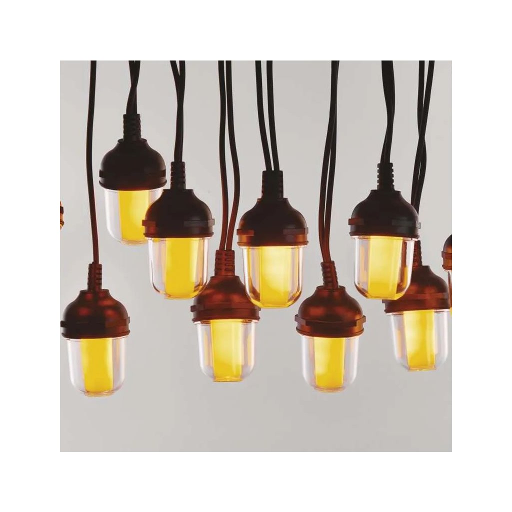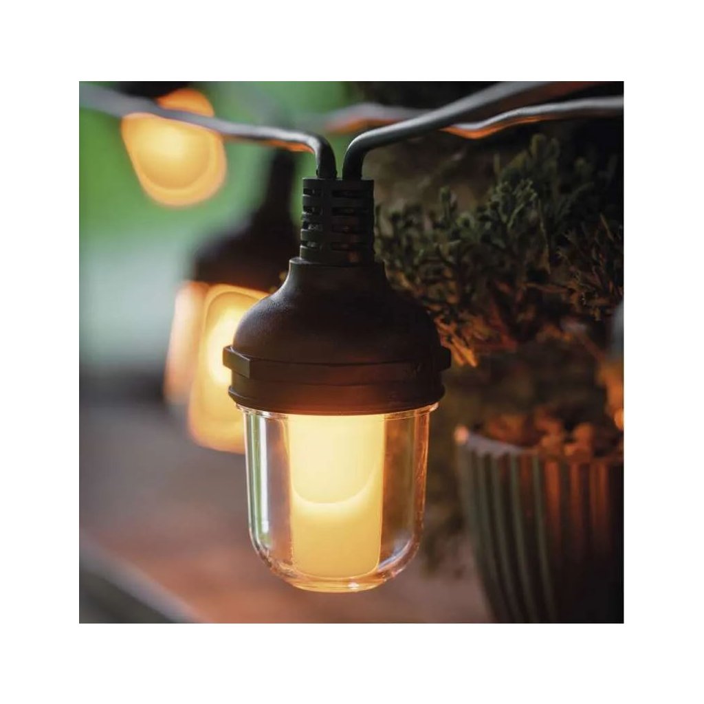Venkovní světelný řetěz s vintage prvky svítícími teplou bílou barvou doladí útulnou atmosféru při posezení na balkoně, terase, venkovních oslavách, svatbách, kulturních akcích a také jako vánoční osvětlení. Při správně zvoleném počtu řetězů dokáže asistovat tradičnímu osvětlení a udělá tak každý den výjimečným. Stále častěji je tento typ řetězu využíván jako stylové osvětlení na zahrádkách či v interiérech restaurací, kde vkusně ozdobí i jinak obyčejný prostor. Díky dlouhému napájecímu kabelu o délce 5 m je jeho zapojení do elektrické sítě hračkou.