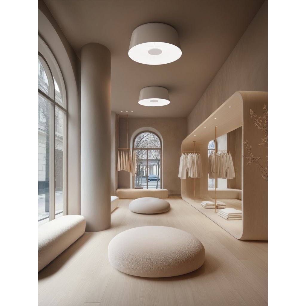 Svítidlo je vyrobeno z hliníku s jemnou texturou v červeno-béžovém odstínu RAL 3012. Matně bílý vnitřek stínidla zajišťuje měkké, rozptýlené světlo, ideální pro vytvoření teplé a vyvážené atmosféry.