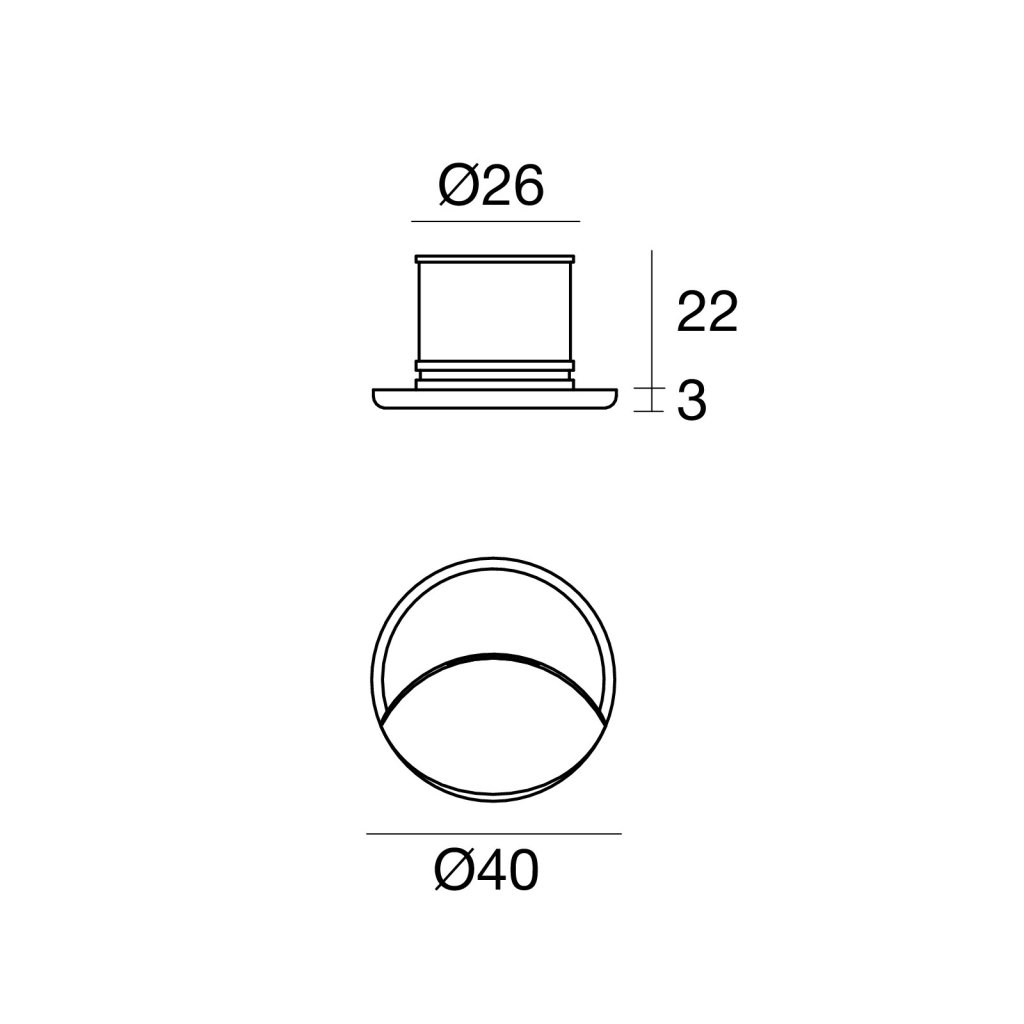 Průměr 4cm, hloubka 2,2cm. Montážní otvor průměr 2,6cm.