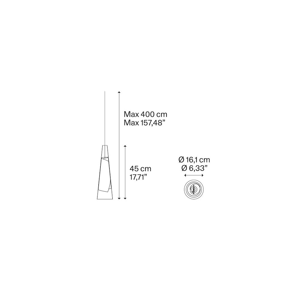 Průměr skla je 16,1cm, výška skla je 45cm. Délka závěsu je 400cm s možností zkrácení při montáži.