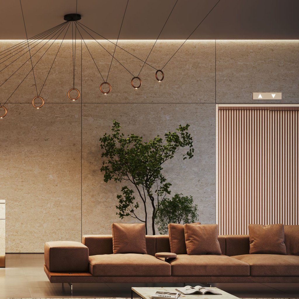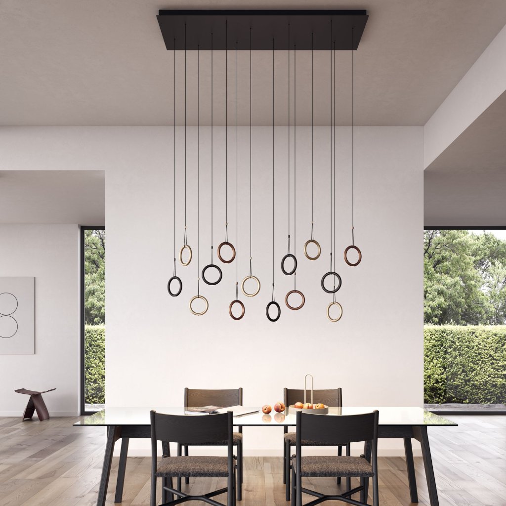 Lodes Ivy I cluster: designové svítidlo, které se díky signifikantnímu kruhu veřejně přiznává k minimalismu a originalitě. Design série Ivy vytvořil Vittorio Massimo v roce 2022, inspirací mu byl svatební prsten. Vyrábí italský výrobce Lodes.