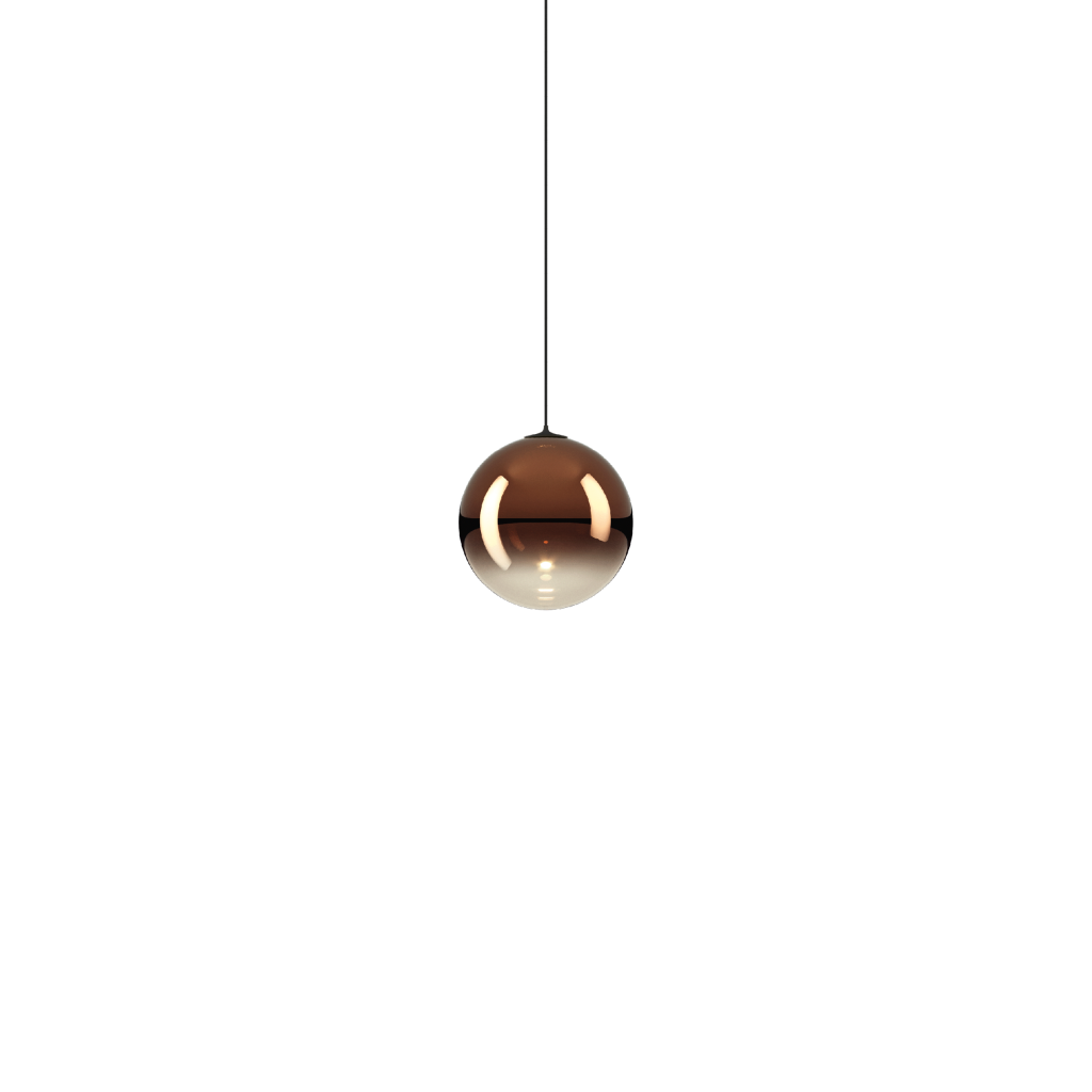 Vyrobeno ručním foukáním z bronzového skla (glossy bronze). Do skla je sofistikovaným způsobem zapracován LED zdroj světla. Průměr kuličky je 10cm, délka závěsu 500cm s možností zkrácení.
