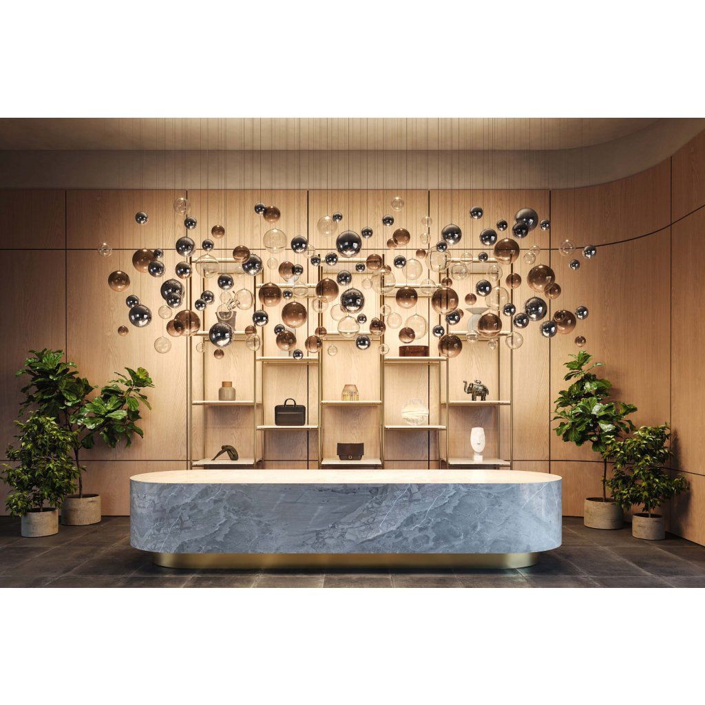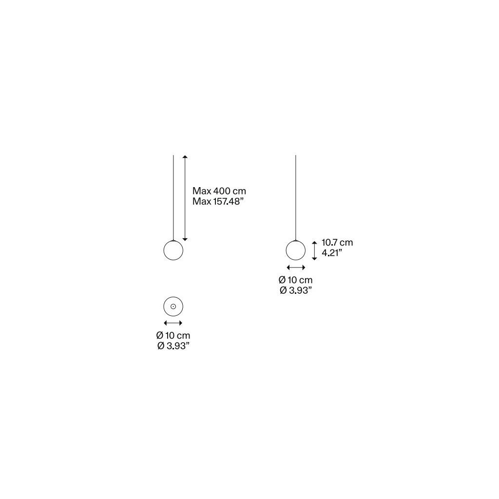 Lodes Random Solo 10: nadčasový tvar kuličky na závěsu s možností kombinace s jinými průměry a různými barvami v rámci jednoho sestaveného svítidla. Autor designu: Chia-Ying Lee, 2024. Vyrábí Lodes, made in Italy.