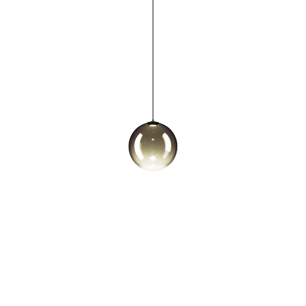 Vyrobeno ručním foukáním z kouřového skla (pale gold). Do skla je sofistikovaným způsobem zapracován LED zdroj světla. Průměr kuličky je 10cm, délka závěsu 400cm s možností zkrácení.