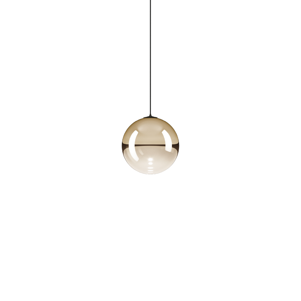 Vyrobeno ručním foukáním ze světle zlatého (pale gold). Do skla je sofistikovaným způsobem zapracován LED zdroj světla na černém kabelu. Průměr kuličky je 12cm, délka závěsu 400cm s možností zkrácení.