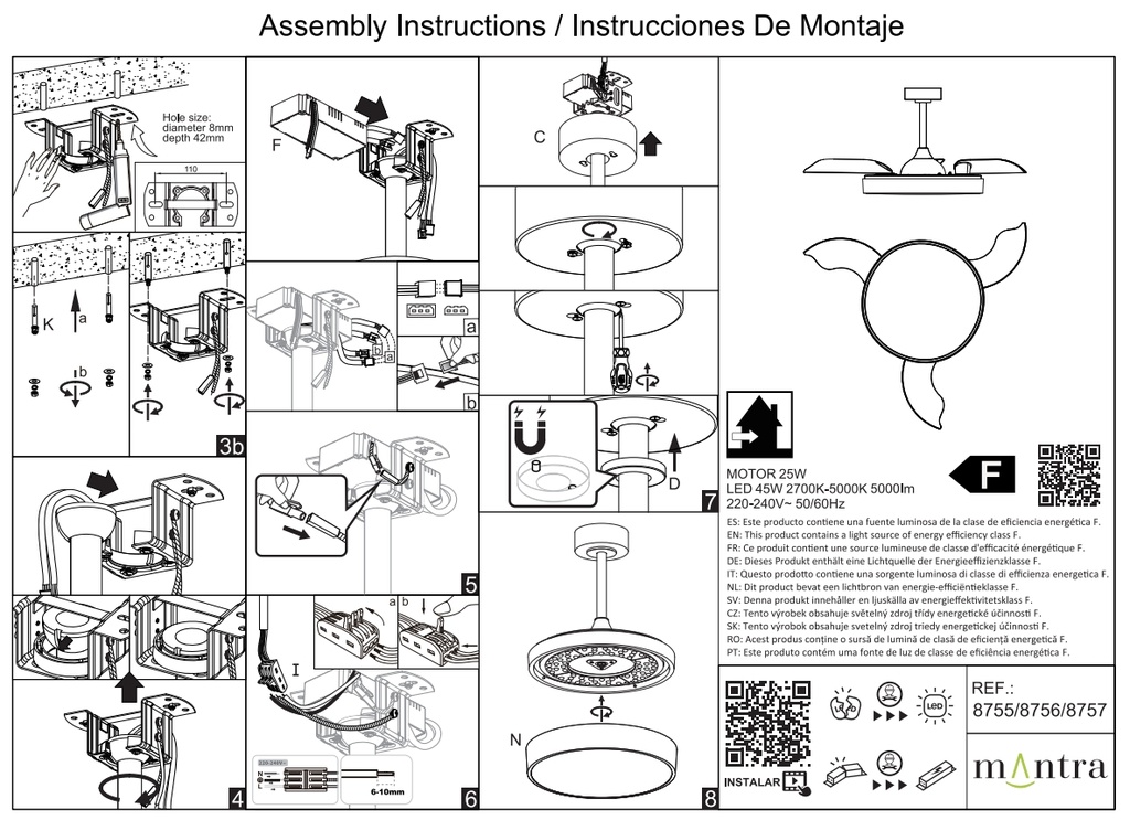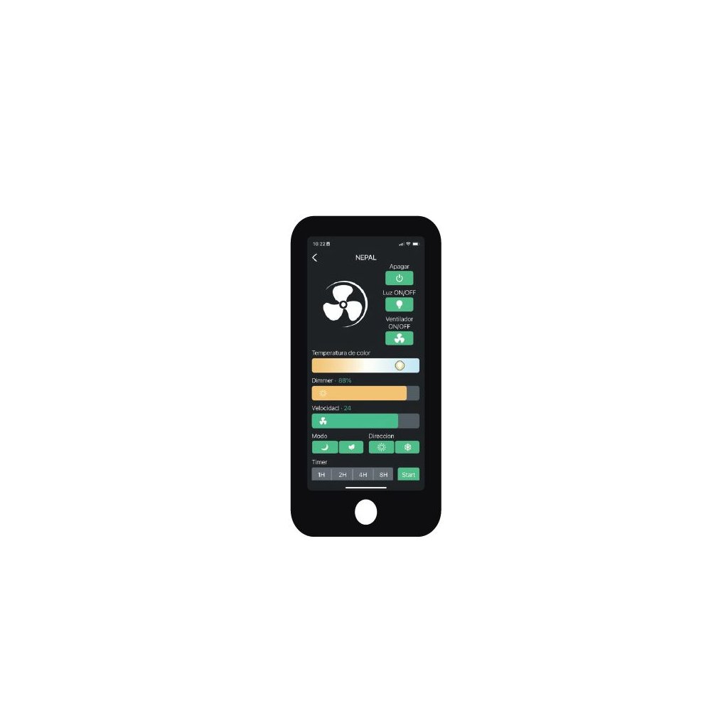 Svítidlo je možné stmívat a ovládat dálkovým ovladačem RF R00142 s displejem nebo bezplatnou aplikací Mantra Lighting App. Svícení i ventilátor je možné ovládat zvlášť, můžete tedy využívat každou z těchto funkcí nezávisle na sobě.