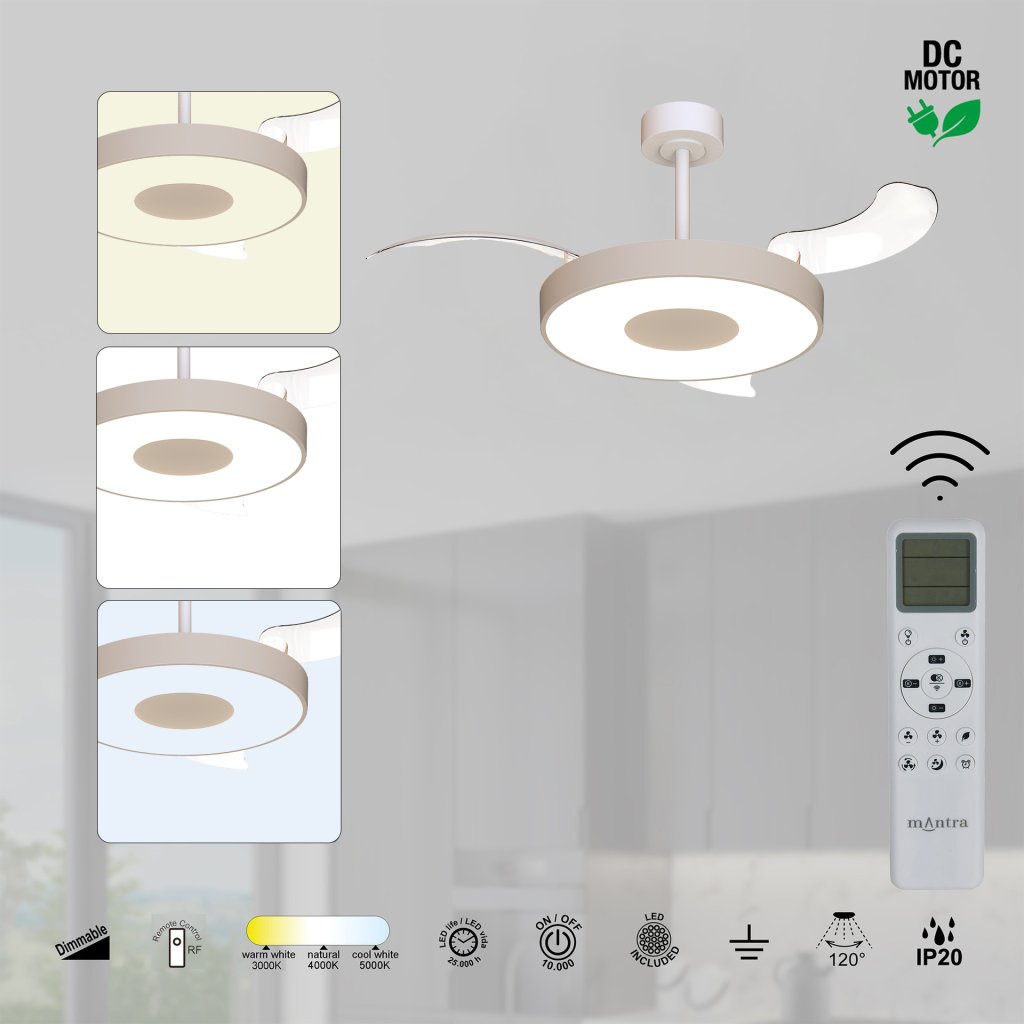 Mantra Coin Smart, rozvinovací ventilátor se svítidlem a dálk. ovladačem, LED 40W 3000-5000K, béžová, průměr 50/106cm