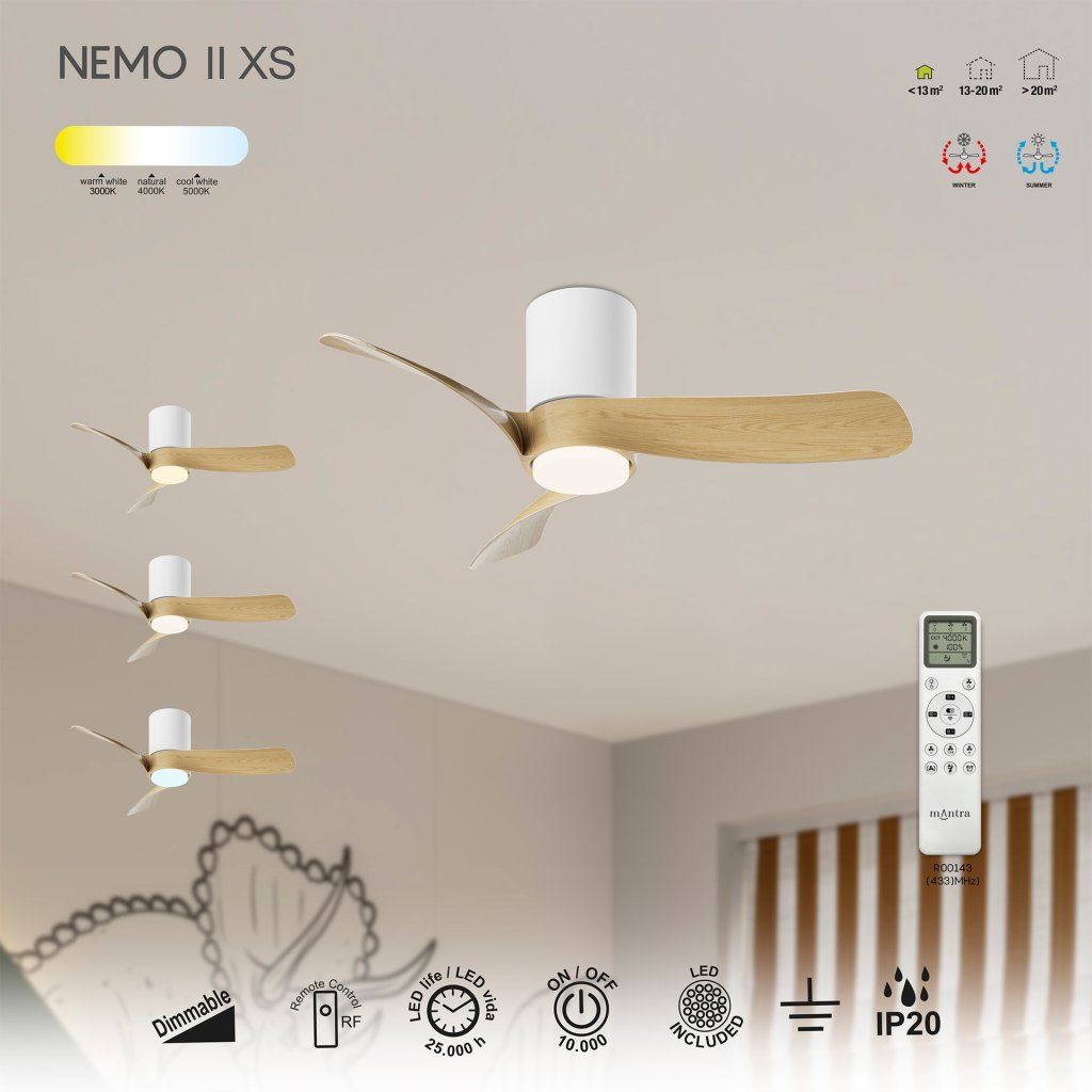 Mantra Nemo II XS, lopatkový ventilátor se svítidlem a dálk. ovladačem, LED 15W 3000-5000K, bílá/dřevěná, průměr 72cm