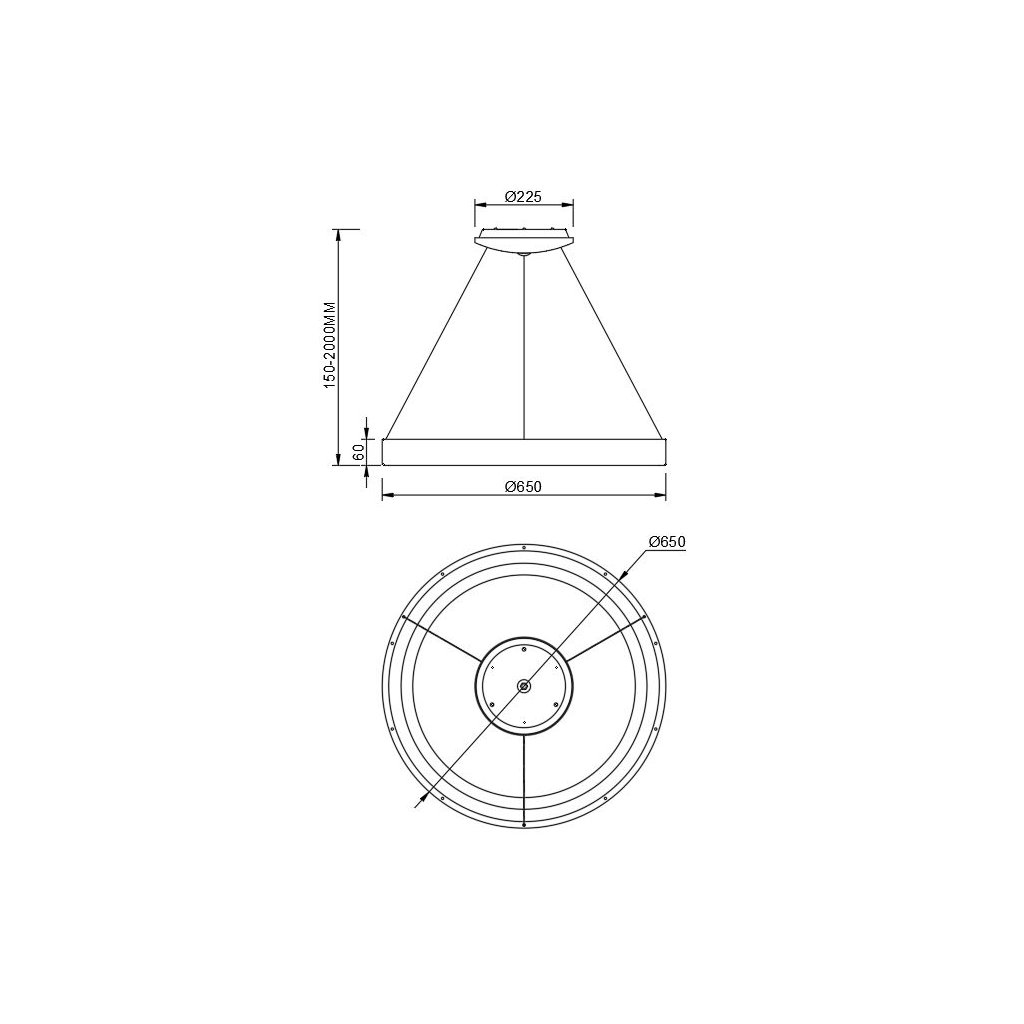 Rozměry kruhu jsou Ø65 x 6 cm, délka kabelu nastavitelná od 50cm do 200cm, stropní rozeta má průměr 22,5cm. Výkon 50W, intenzitu 3760lm, teplota světla měnitelná v rozmezí 2700-5000K, životnost 30 000 hodin a 5letou záruku.