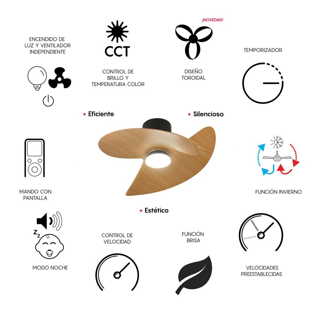 Integrovaný 18W LED modul se světelným tokem 2520lumenů je dostatečně výkonný i na vetší místnost. Svítidlo je ovládané dálkovým ovladačem RF R00235 s displejem a umožňuje stmívání, změnu teploty barvy světla od teple bílé 3000K až do denní bílé 5000K. Nastavení časovače i nezávislé ovládání svícení a ventilátoru.