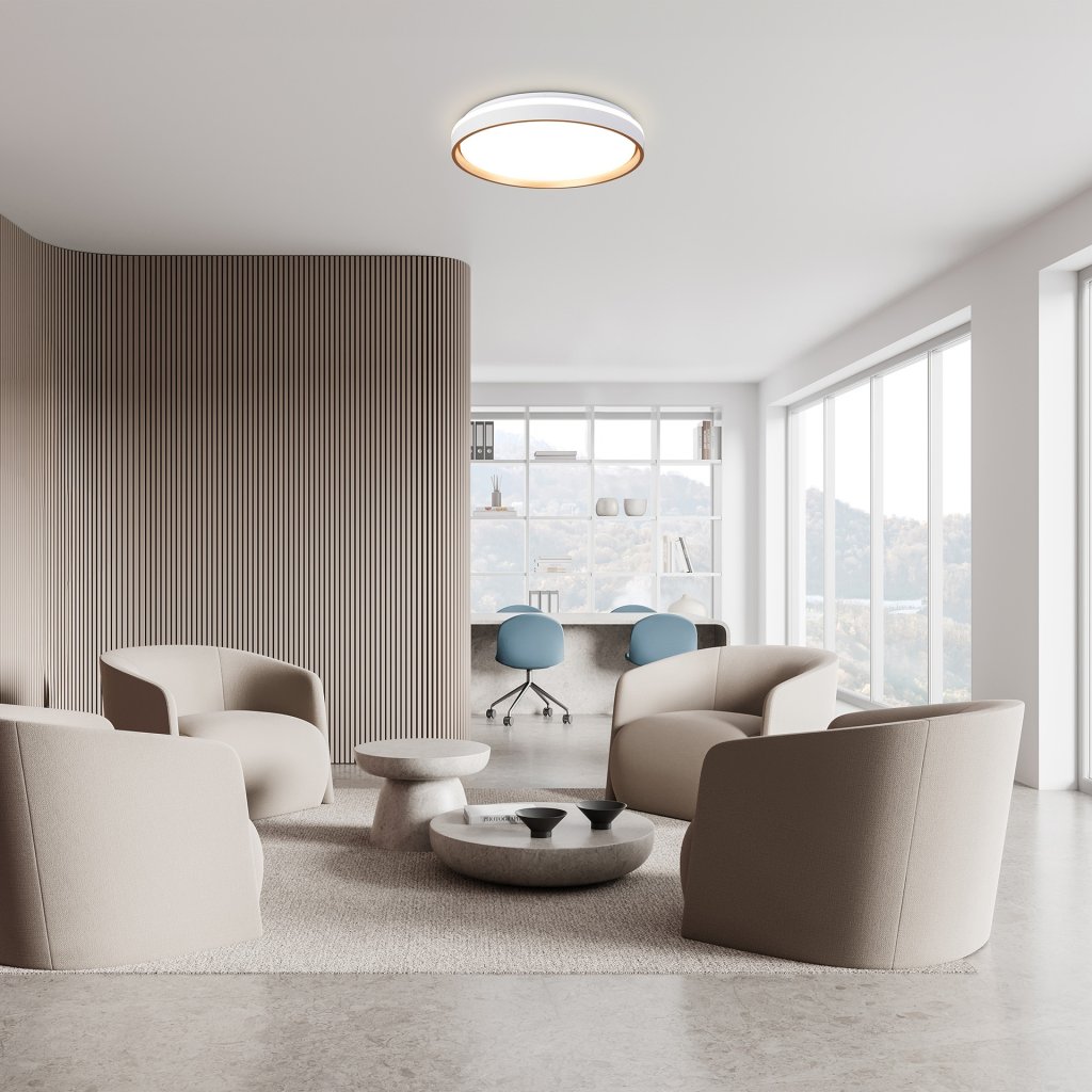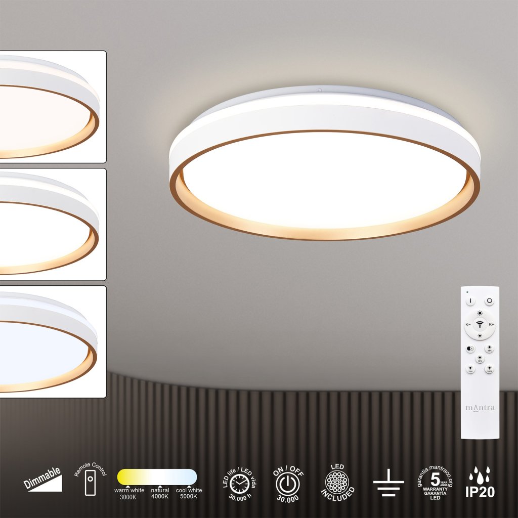 Jednou z hlavních výhod tohoto designového stropního svítidla je to, že je stmívatelné jak v intenzitě, tak v barevné teplotě. Tímto způsobem můžete vytvořit různé atmosféry v závislosti na denní době. A to vše na dosah ruky díky dálkovému ovládání. Můžete ho zkombinovat s jakýmkoliv stylem dekorace a díky svému designu nikdy nevyjde z módy.