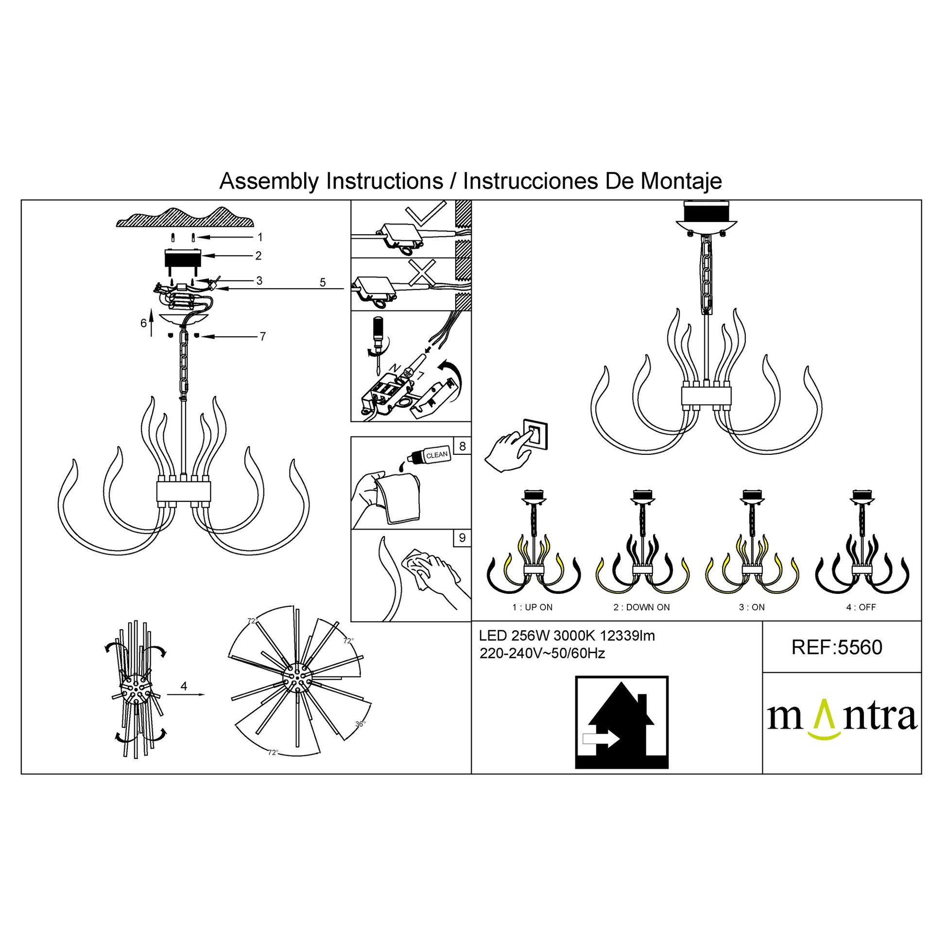 Celkový výkon je 256W, teple bílá barva světla 3000K, svítivost 12339lm, průměr 103cm.