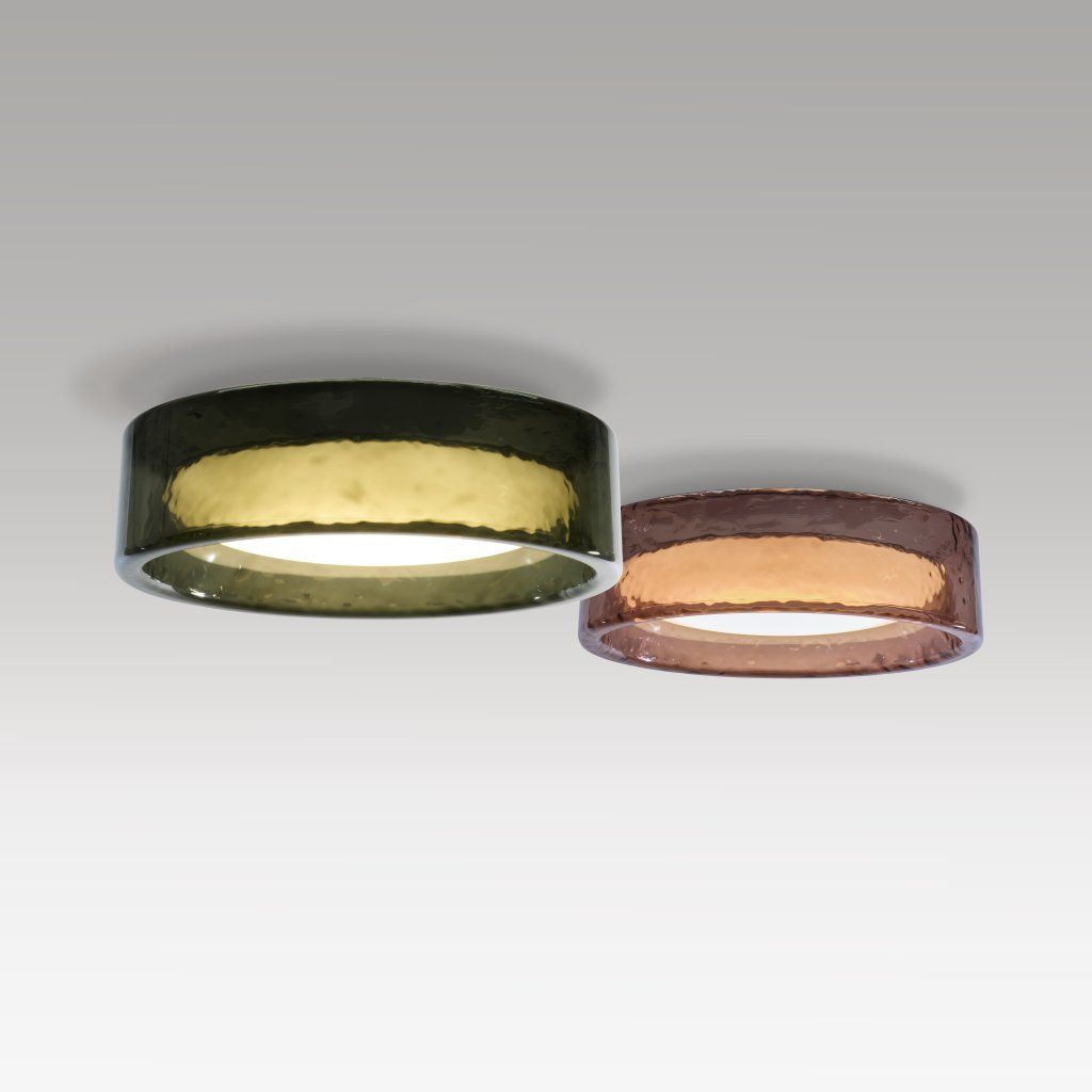 K dispozici ve stropní verzi a závěsné verzi, ve dvou velikostech, 70 a 90 cm, a ve čtyřech povrchových úpravách: zelená, růžová, kouřová a tmavě kouřová.
