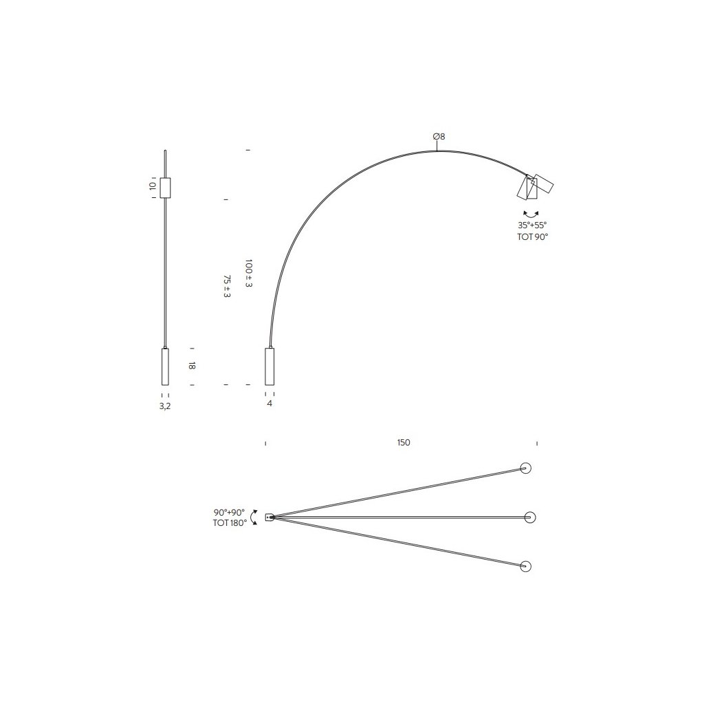 Výška 100cm, hloubka 150cm. Rameno lampy je možné otáčet doprava a doleva v úhlu 90 stupňů.