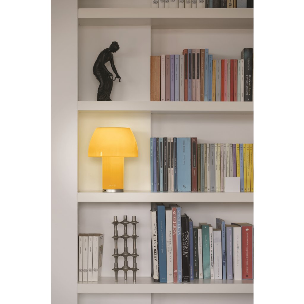 Lampička se vyznačuje svým průsvitným sklem s žlutým odstínem a bílá vnitřní část difuzéru zachovává přirozenou barvu světla.