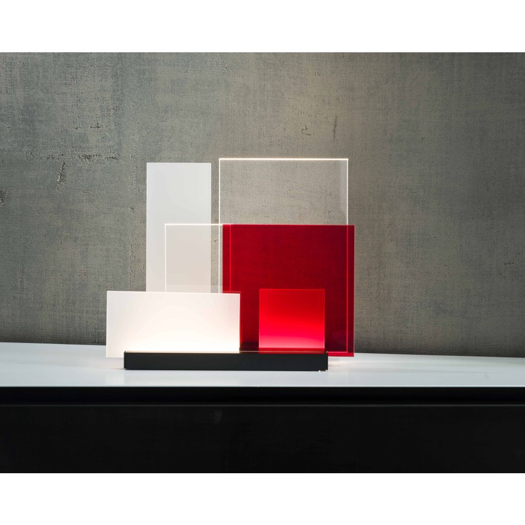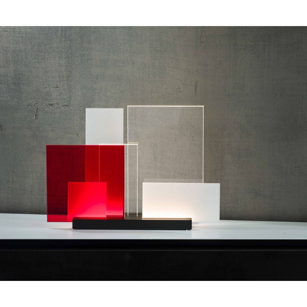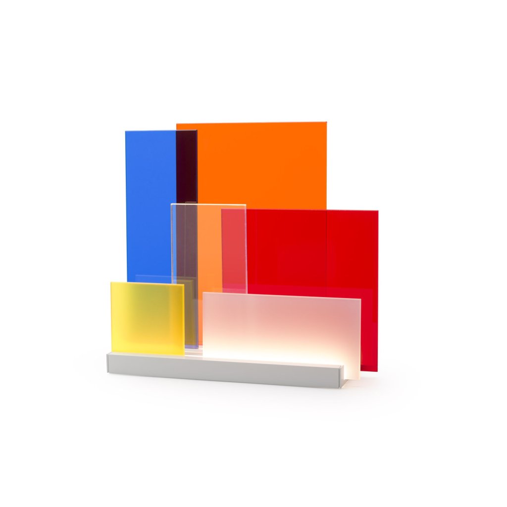 Nemo On Lines: netradiční stolní lampa, která se skládá z bílé základny se 4 kolejnicemi a 9 barevných destiček s různými rozměry, které je možné různě seskládat. Autor designu: Jean Nouvel, vyrábí italský výrobce Nemo. Jean Nouvel je francouzský architekt s mezinárodním věhlasem, držitelem několik cen v oblasti architektury a umění.