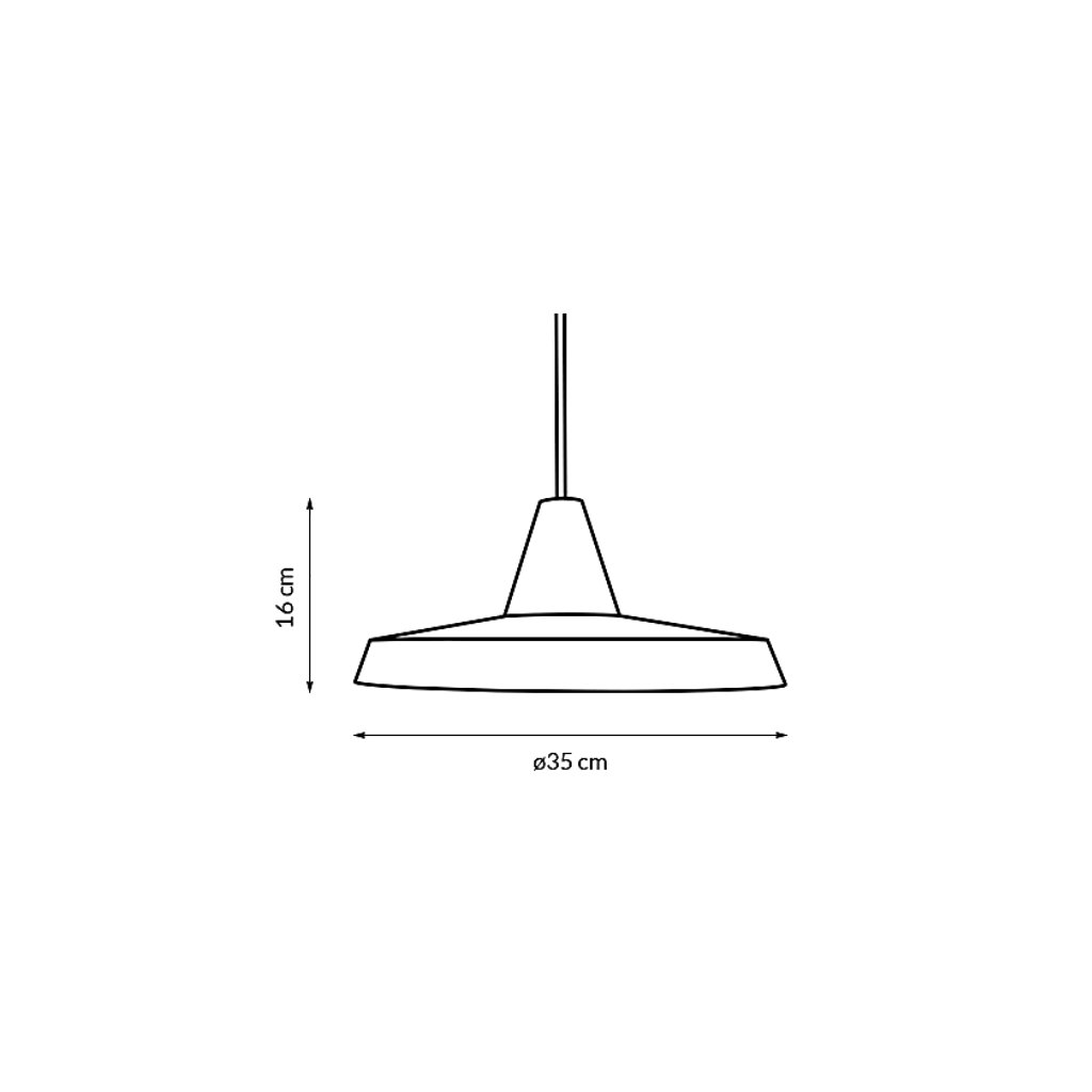 Průměr 35cm, výška 16cm. Maximální délka závěsu 210 cm s možností zkrácení. Bílá rozeta má výšku 10cm, průměr 12cm.