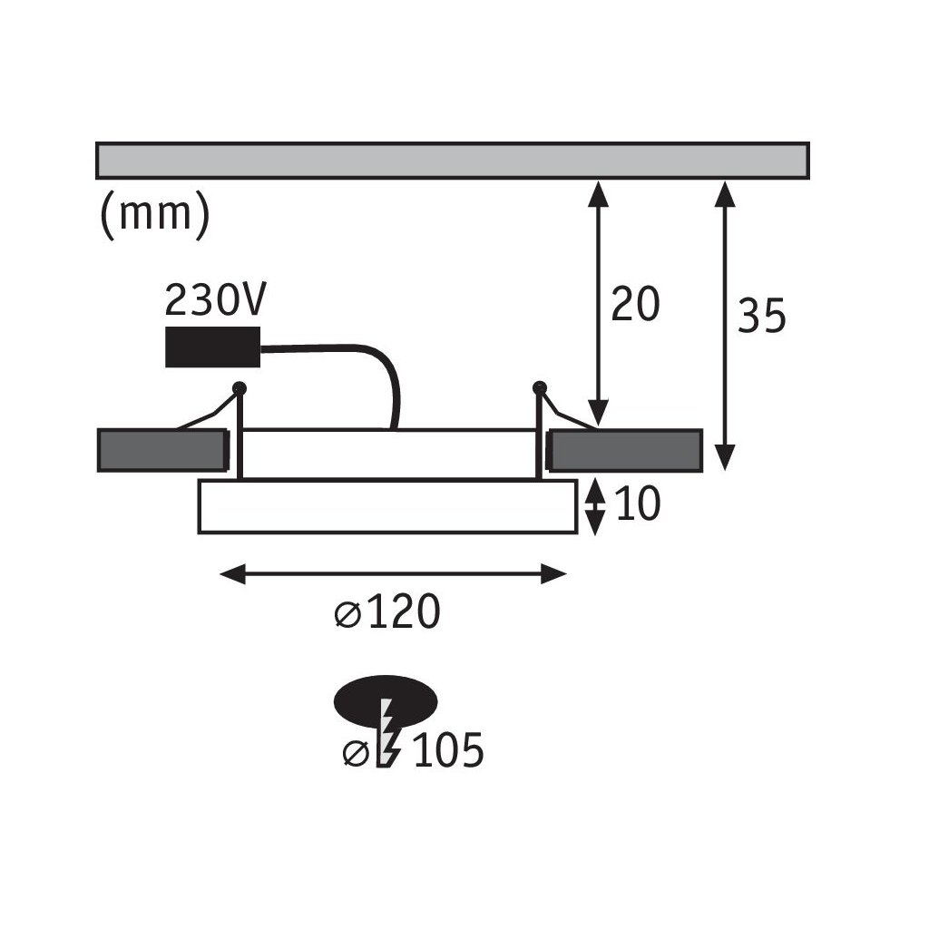Průměr: 12cm, výška: 1cm, zápustná hloubka: 2cm. Montážní otvor: 10,5cm.