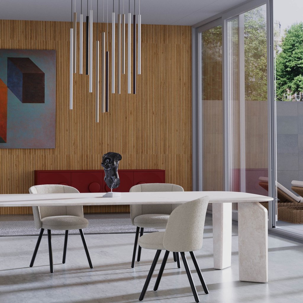 Závěsné svítidlo v minimalistickém rázu se svícením směrem dolu. Vyrábí rumunský výrobce Redo Group, série Kanji.