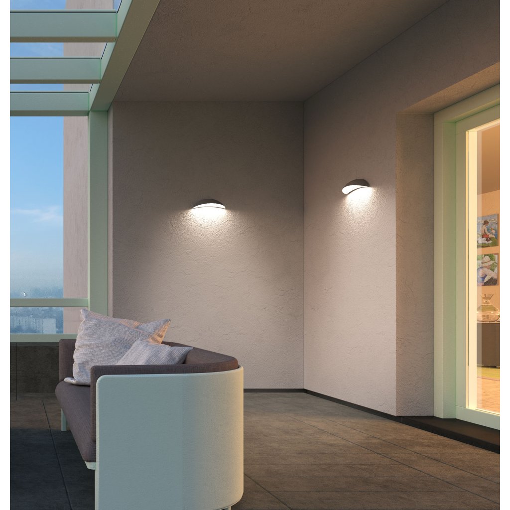 Venkovní nástěnné svítidlo je vhodné zejména k osvětlení prostoru okolo domu. Má konstrukci z hliníkové slitiny v pískově antracitové barvě a saténový polykarbonátový difusor. Svítidlo je 34,6 cm široké.