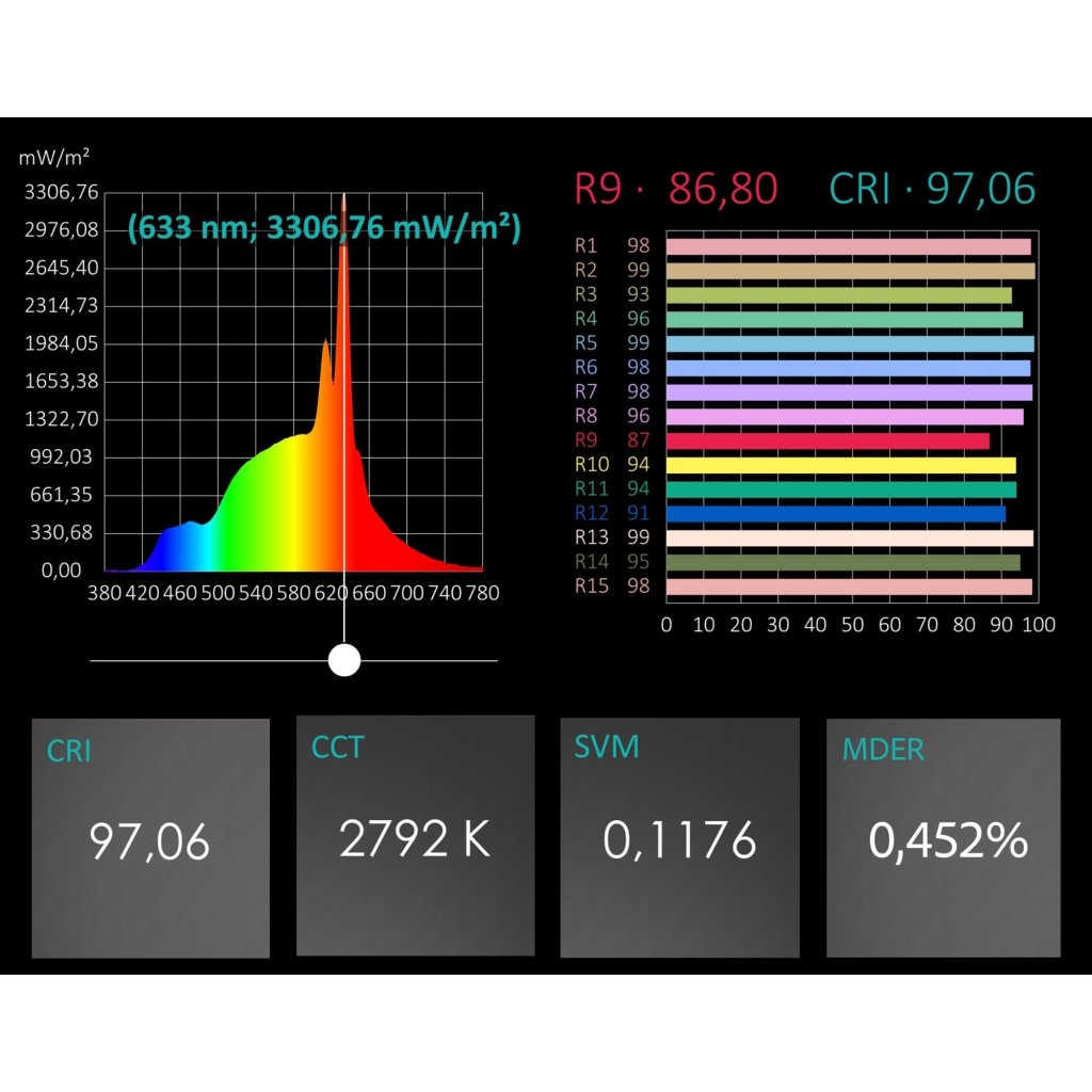 Index podání barev Ra95 (CRI95). Tato hodnota říká, jak přirozeně budou vypadat barvy pod tímto světlem přičemž nejlepší je hodnota 100, nejnižší povolená pro osvětlení domácnosti je 80.