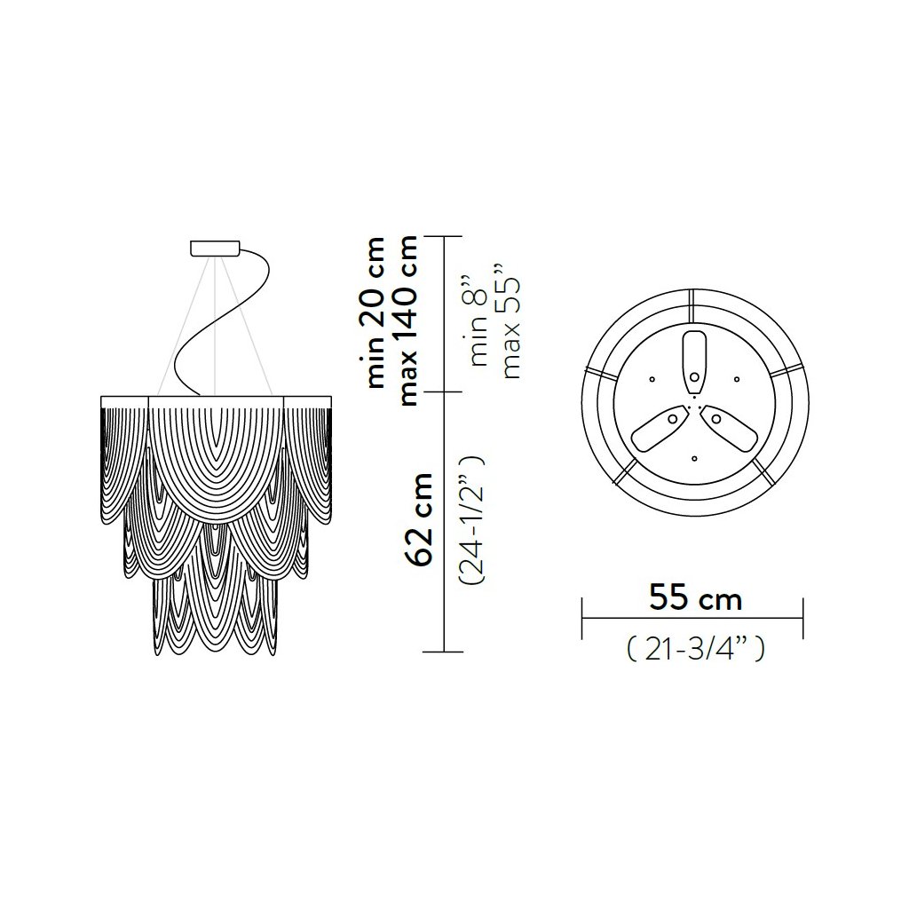 Průměr 55cm, výška 62cm, délka závěsu: 140cm s možností zkrácení. Nejkratší délka závěsu je 20cm.