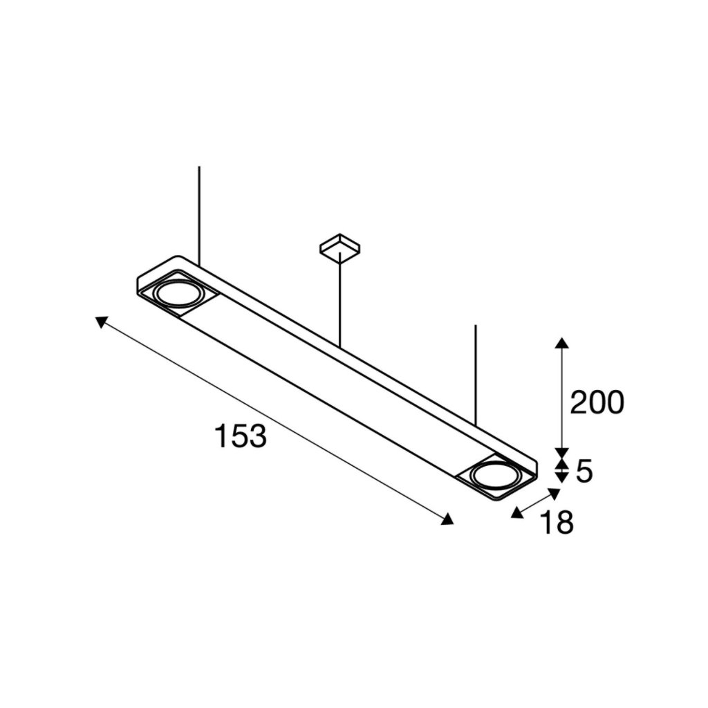 Vyrobeno z hliníku s bílou povrchovou úpravou. Délka: 153,5cm, šírka: 18cm, výška: 5cm. Svítidlo visí na 2 závěsech délky: 200cm, které je možné lehce zkrátit. Stropní rozeta ve stejném barevném provedení jako svítidlo a je volná, tzn. zavěšení svítidla není omezeno elektrickým vývodem. Jednoduchá montáž na strop pomocí hmoždinek.