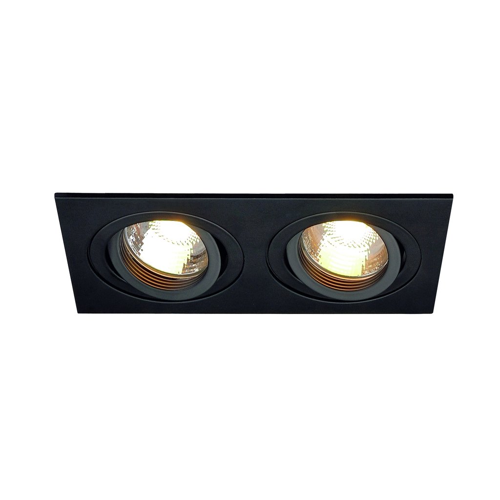 Hranatá bodovka z černého hliníku pro 2 tzn. retrofity, vyměnitelné žárovky se závitem GU10 do sádrokartonu tloušťky 30mm. Univerzální použití v interiéru: od použití v kuchyni, chodbách až po obývací pokoj. Bodovku New Tria GU10 vyrábí německá firma SLV.