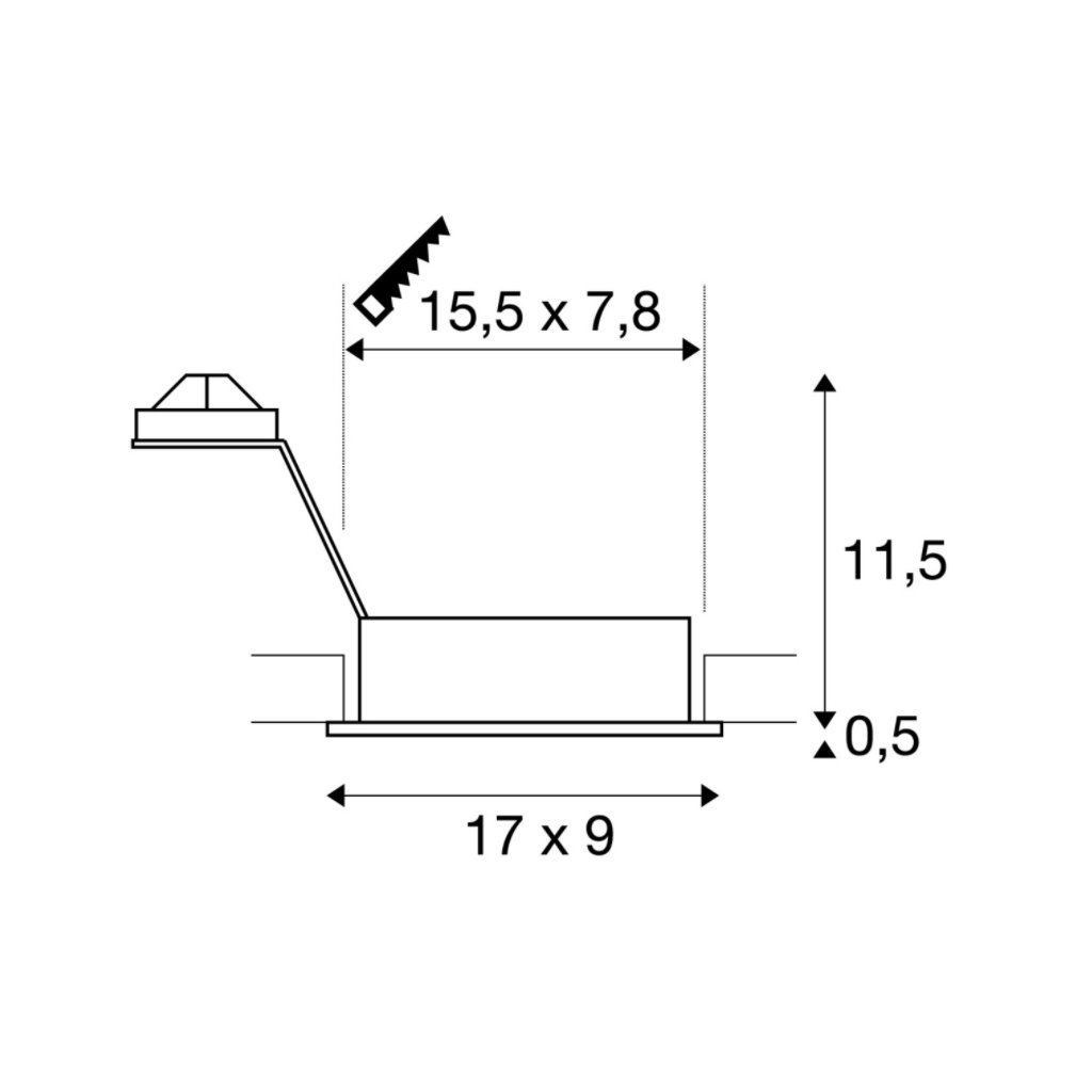 Rozměr 17x9cm, montážní otvor: 15,5x7,8cm, zápustná hloubka: 12,5cm. Otočný reflektor 360 stupňů, výklopný 30 stupňů.