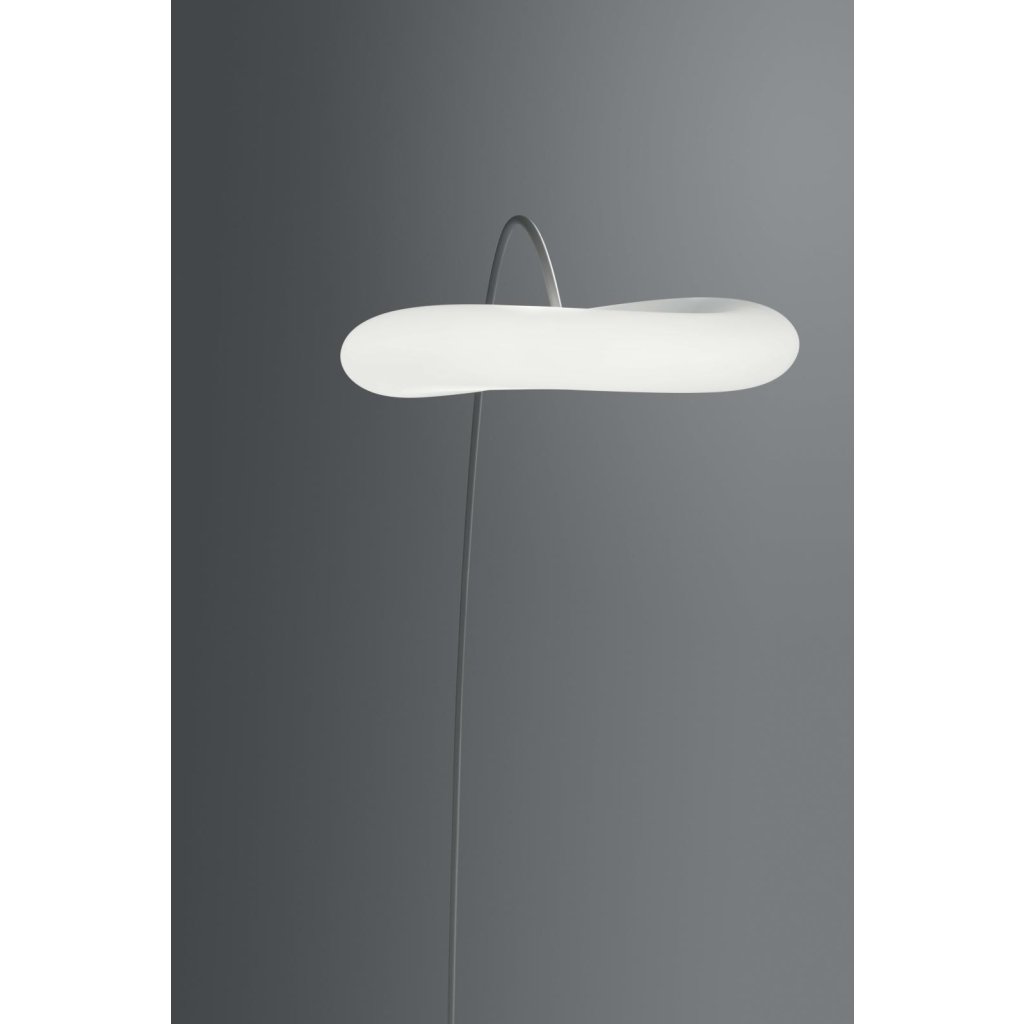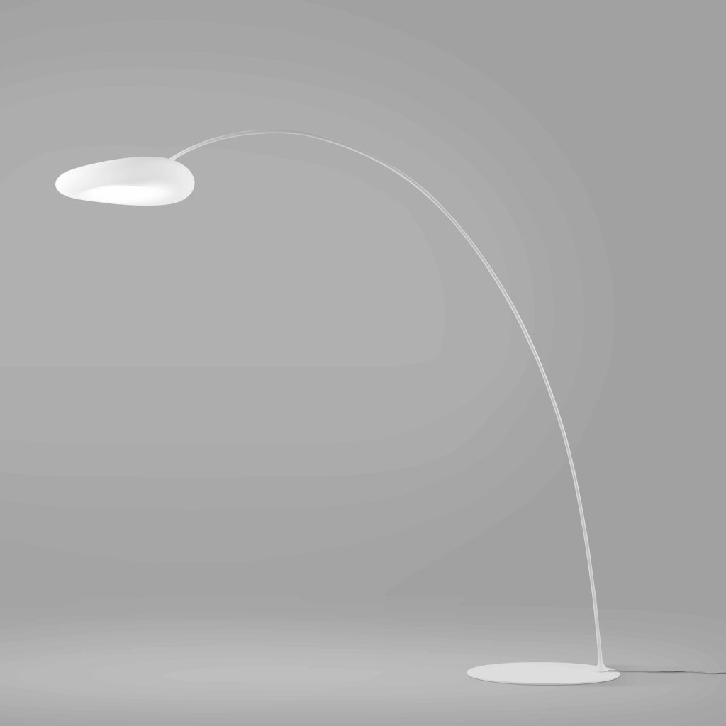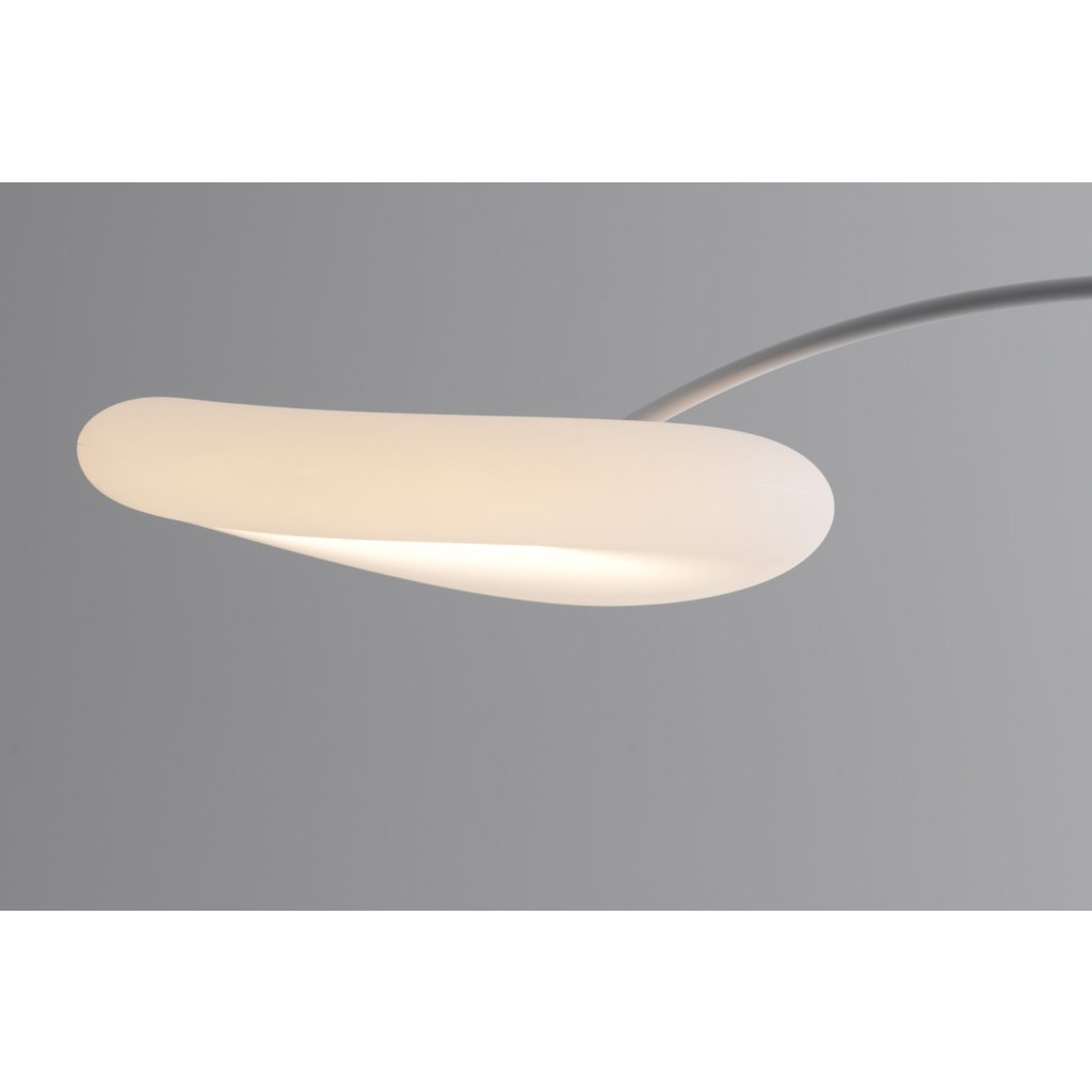 Oblouková stojací lampa se stínítkem průsvitného polyethylenu. Lampa je vhodná pro doplnění stopního nebo závěsného svítidla Magoo, ale i jako samostaný objekt do obývacího pokoje.