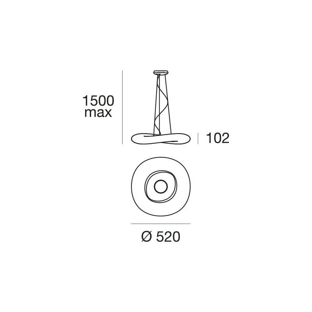 Průměr svítidla: 52cm, výška difusoru: 10,2cm, maximální délka závěsu: 150cm s možností zkrácení. Průměr stropní rozety: 17,8cm. Váha: 2,41kg, IP20.
