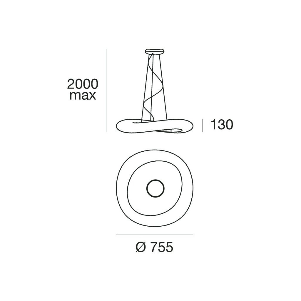 Průměr svítidla: 75,5cm, výška difusoru: 13cm, maximální délka závěsu: 150cm s možností zkrácení. Průměr stropní rozety: 17,8cm. Váha: 6kg, IP20.