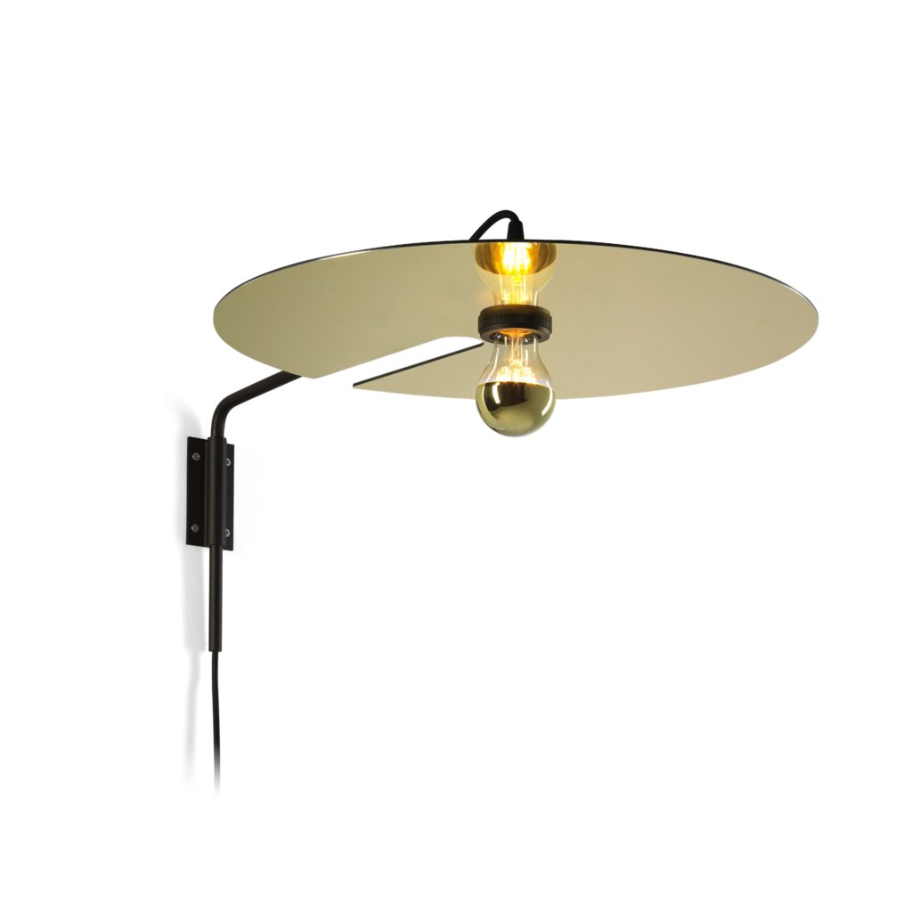 Moderní nástěnné svítidlo v kombinaci kulatého tvaru se zlatou, zrcadlovou úpravou a přiznanou žárovkou. Vyrábí Wever Ducré, design: 13&9 Design.